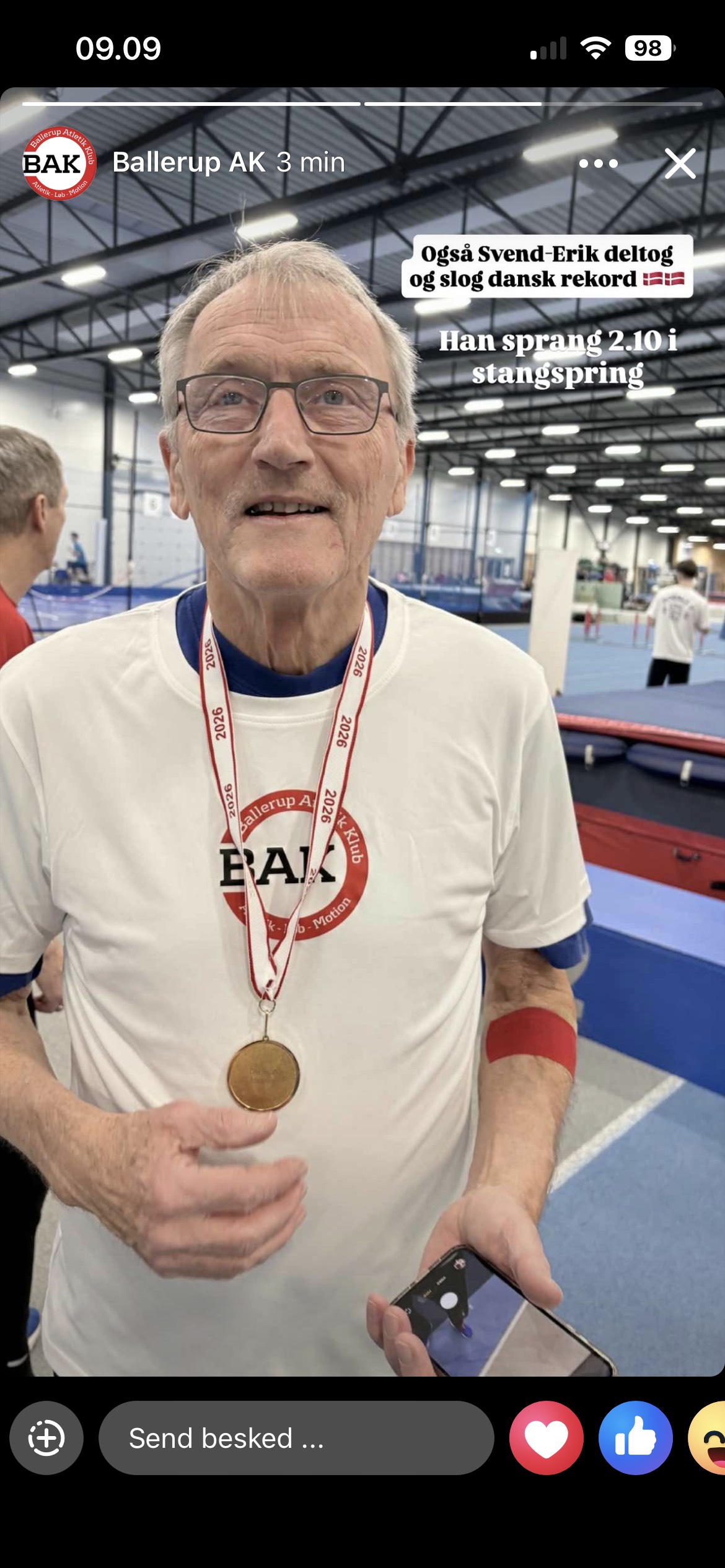 Connie Holm 70+'er blev Dansk mester i kugle stød med 8,37m og Ulla V. Nielsen var 2cm fra en dansk rekord i kuglestød og fik guld med 9,20m. Sven-Erik Dreisig var mest glad for sin rekord og første plads i stangspring med 2,10m. Om søndagen viste øvelserne i 5 kampen og i 60m hæk at knæet ikke er ok. Det siger jo alt når en ikke-kaster får flest points i kuglestød! Men hækken var ok og Svenne var ca. 110 points fra en dansk rekord